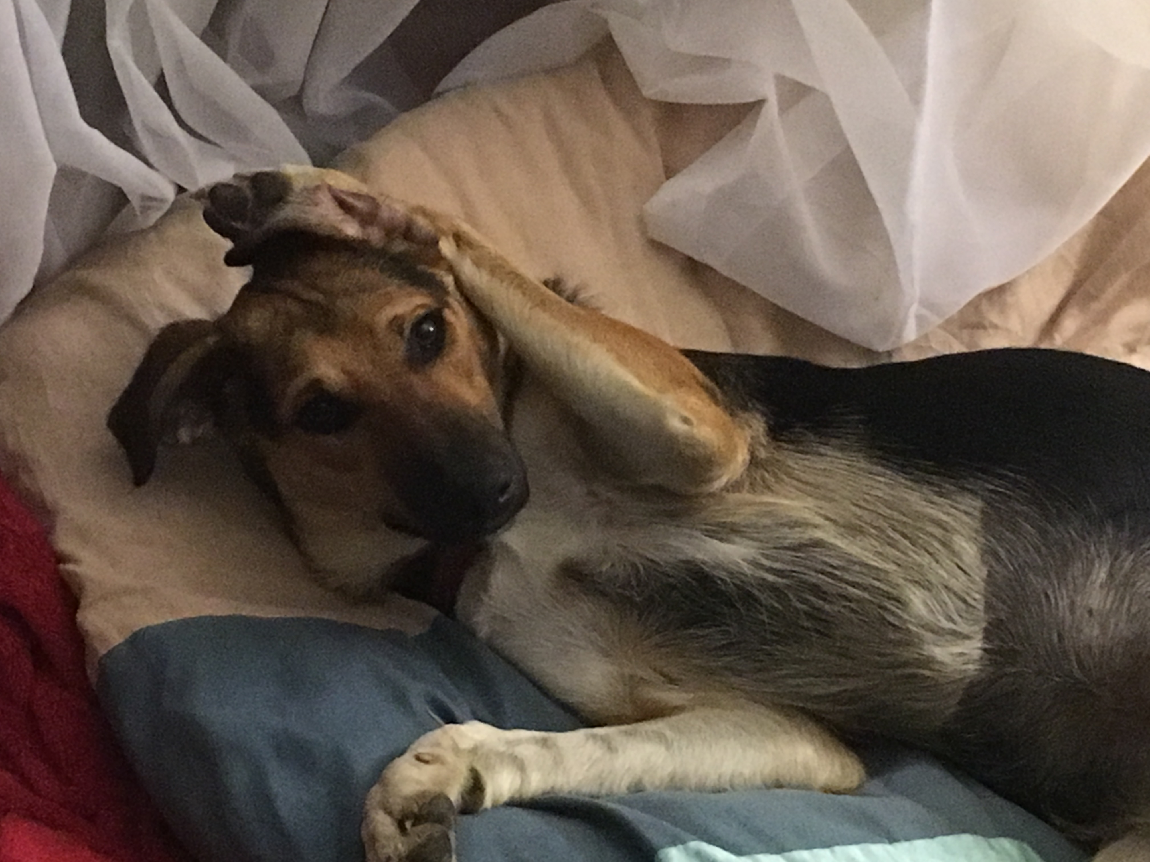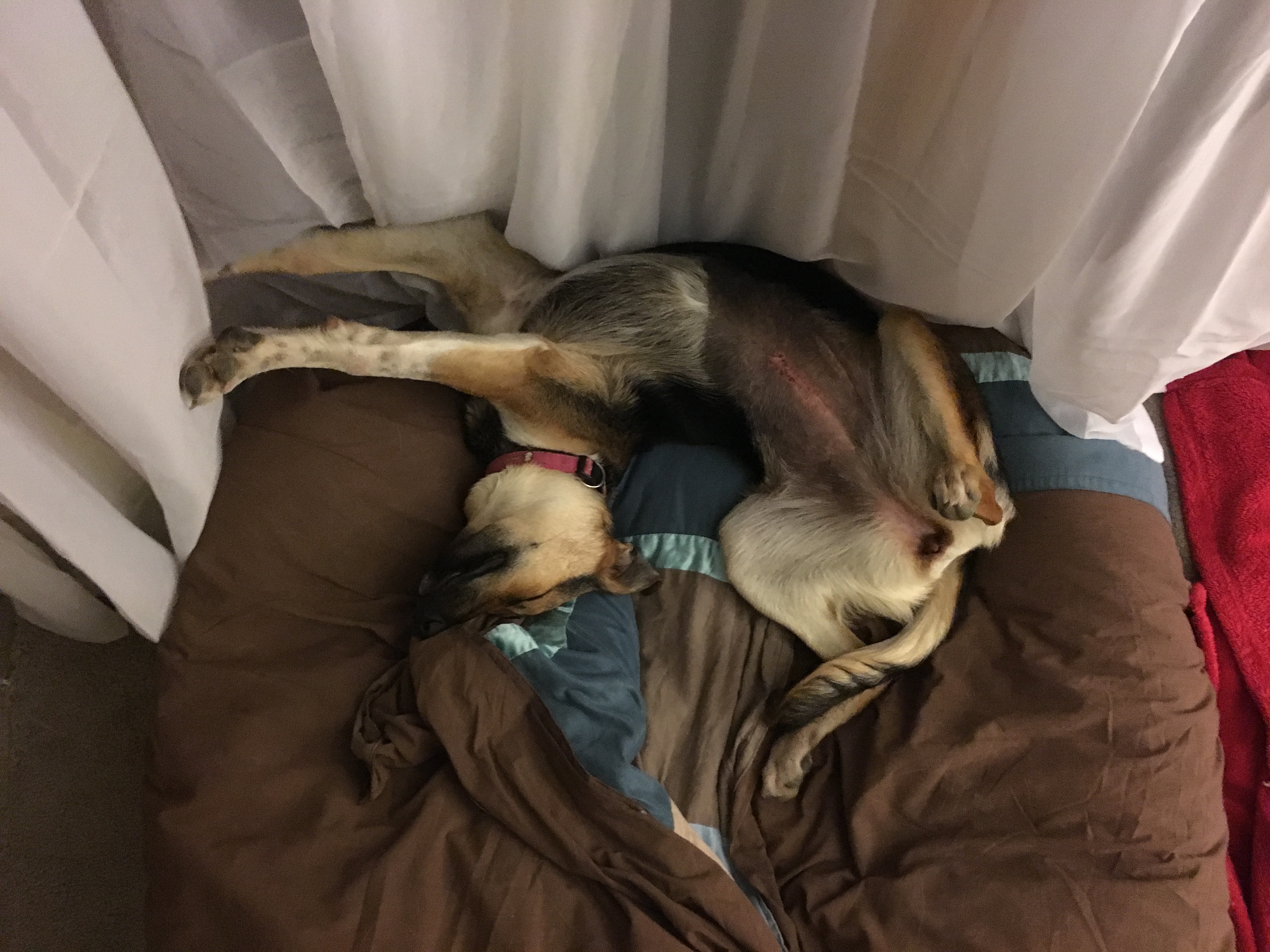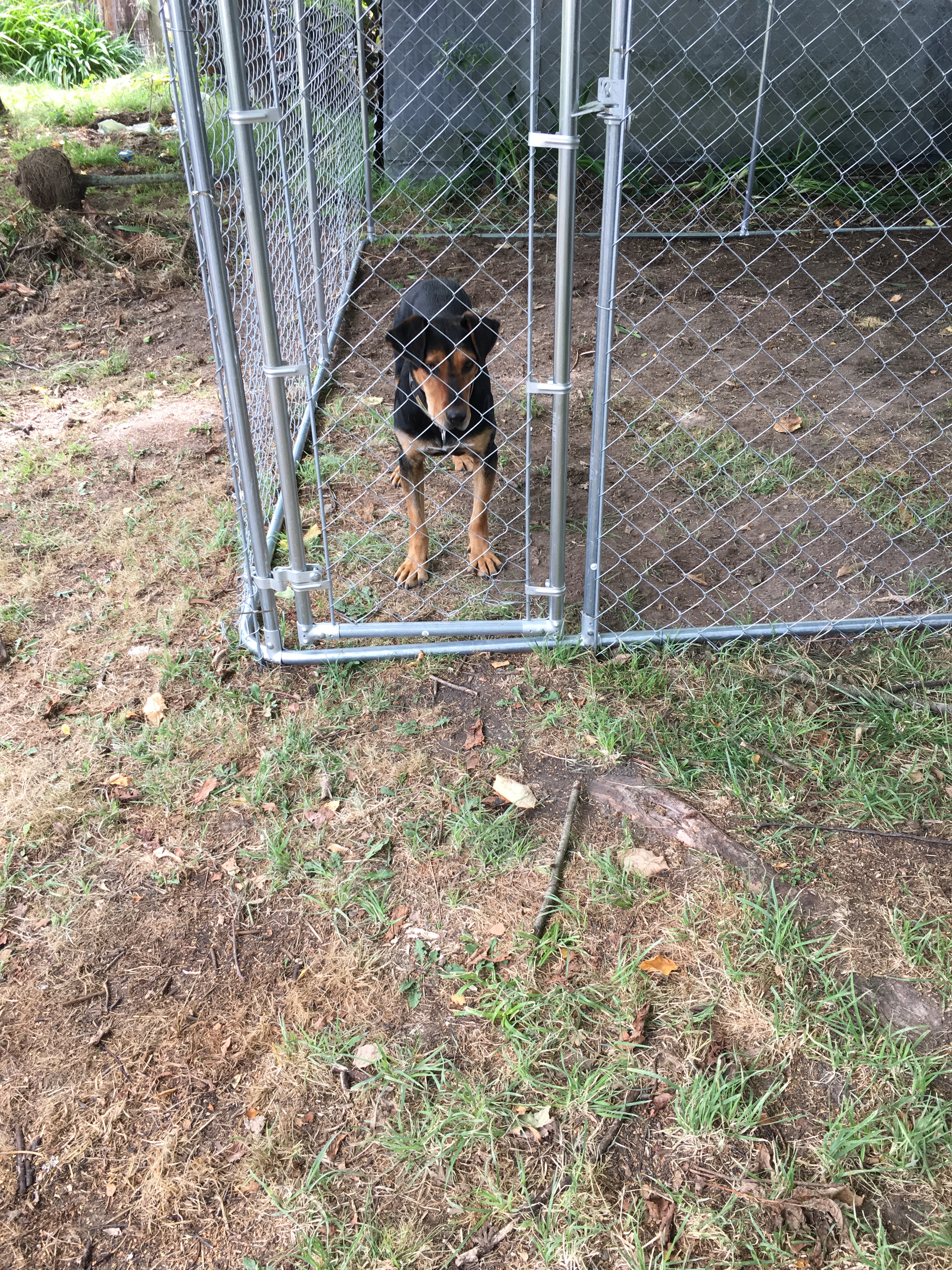 Anyway, we got him in the ute and head off to get Flo. But my heart felt for this boy… how much more did he have to endure. Yes he was going to the RWD, but he would no doubt be rehomed again and who is to say he would be treated any differently to how he was in the past. But, we dropped him off and took Flo. But this boy bugged me. I did mention in passing to the RWD that if they needed a foster home for him, we would take him. Well.. it was not a week later when I received a call from the RWD and asked if we would take Tim.(aka Grant). He was not a TIM… but he was not our dog, so TIM it was! I was pleased to take him, but was he going to be more than we could handle. Dog #6… another scatty rescue??? I met the RWD the following Sunday and took owner ship of Tim, who immediately became Tye. When called Grant and Tim, there was no response from this beautiful boy, but when I call him Tye, the response was instantaneous. Whether that was is name previously or he preferred it to Grant or Tim, we will never know!? Having never been in a house, let alone a bed and no cage..Tye has taken to family life well. After 2 weeks with us, we finally got a small wag from his tail. Baby steps… life is accomplished by using baby steps!