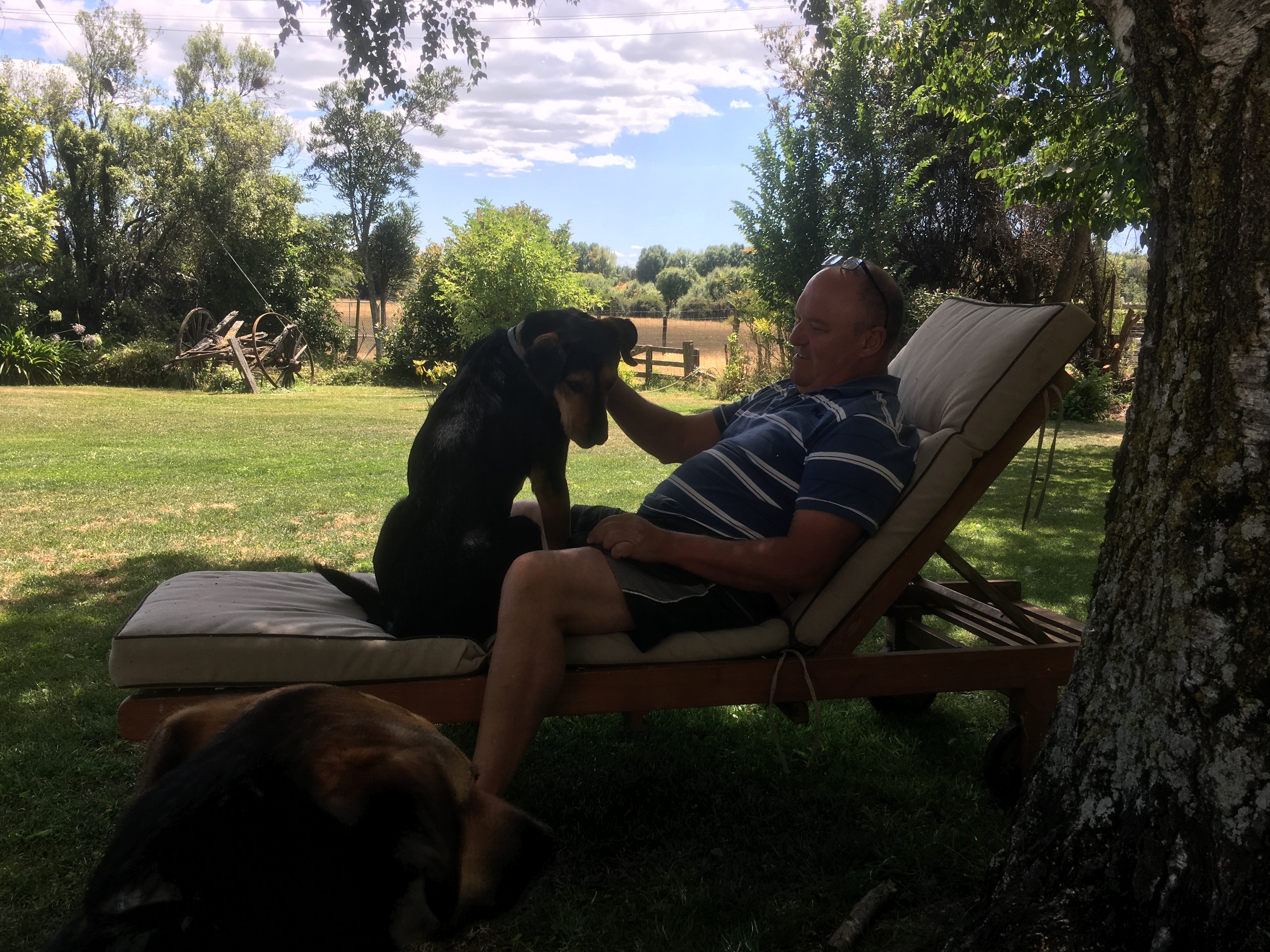 But that was still not enough for us… no.. we decided we needed a Ned replacement. Jess was still too young and clueless and we had not taught her much, so hopefully we would find another Ned. We found an organization called The Retired Working Dog (RWD). After much chatting to these ladies, we found Flo but with Flo came Tye. You see… we had to pick Flo up from a farm 6 hours north of us, but en rout the RWD asked if we could pick up anther dog at the Feilding (spelling is correct) pound and bring him up. Seeing we were taking Flo, they had room for another rescue. Which we were happy to do. But when we got to the pound, this boy was so traumatized, that he tried to hide under piece of wood from a bench! What the hell had this boy been through!? The awesome lady at the pound, said that he was picked up, covered in ticks, to the extent that they were bursting and just falling off him. Scared out of his wits, he had been so badly mistreated.. kicked and beaten ,there was almost no soul left in this boy. My heart sank…how could people do this to these animals. What we have learn while becoming involved with farming, is that there are some farmer who are complete a-holes. If they no longer wants a dog, they will either shoot it or take it out and drop it off in the middle of no where and drive away! We think, this is what happened with this boy, whom the pound named Grant. Grant… who calls a dog Grant!!! I had no doubt the new owners or foster people would change his name. Even he thought the name was shite!
